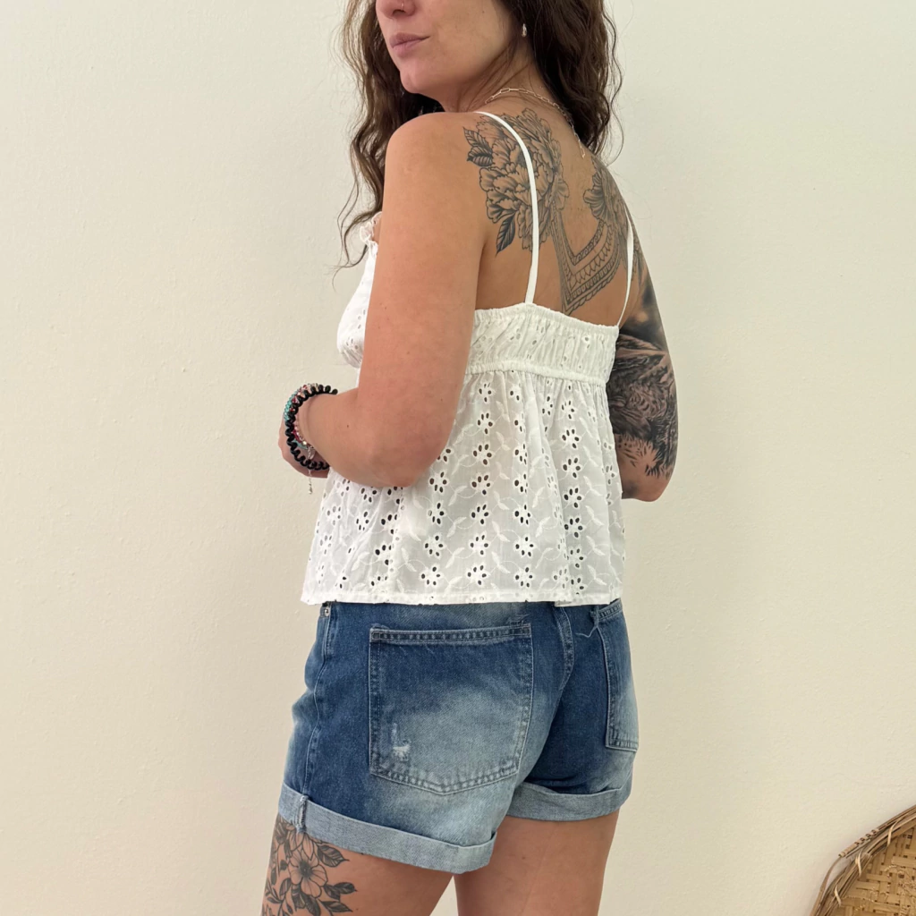 Musculosa de broderie, con botones y abierta abajo. El bajo busto es elastozado