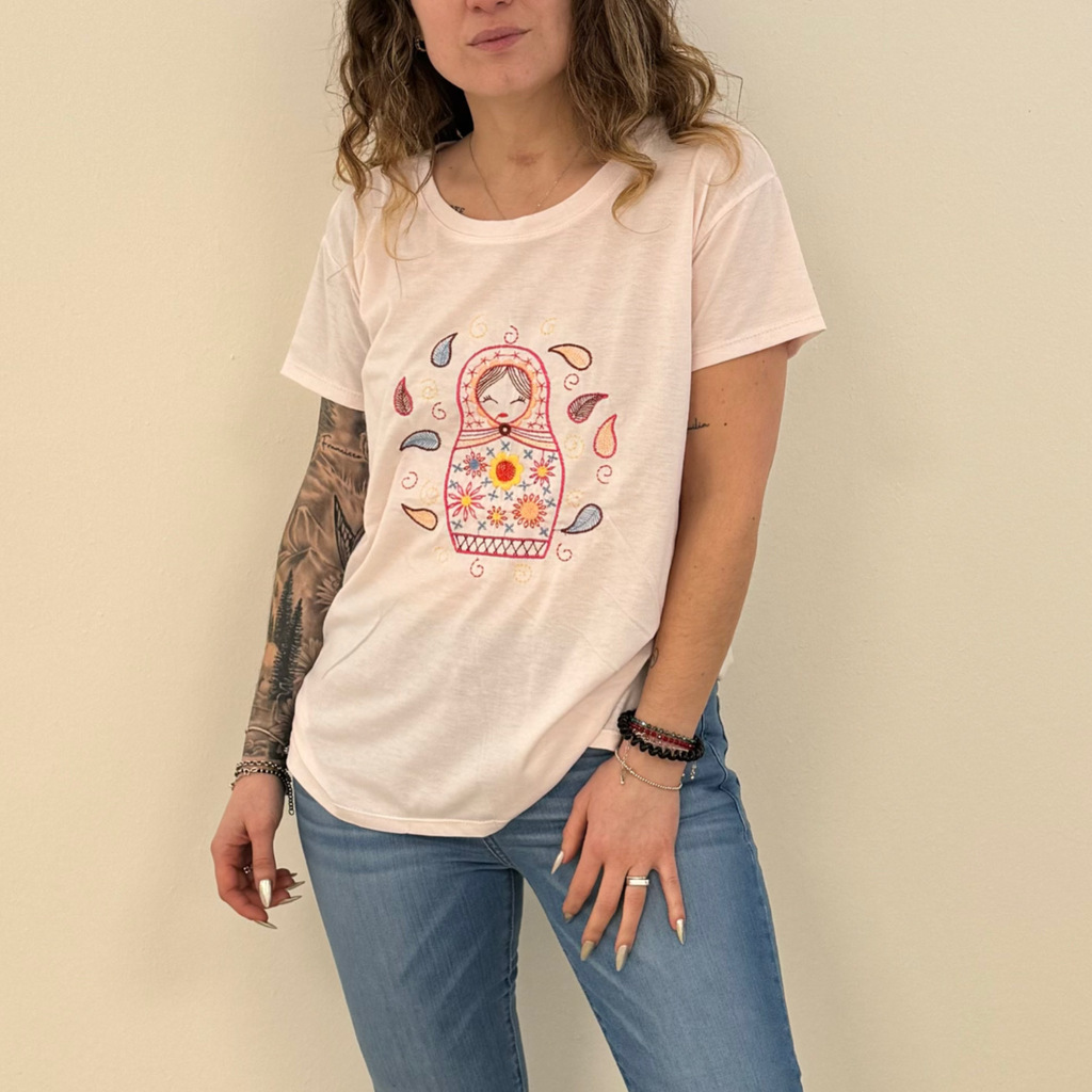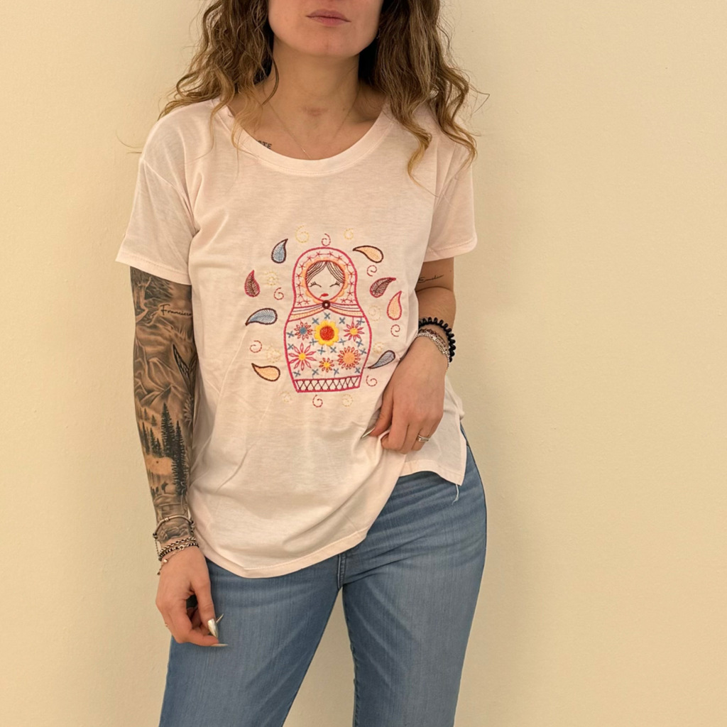 Remera Mamushka Blanco. Si amas los looks delicados, esta remera es para vos. De algodón, súper fresca y básica bordada.
