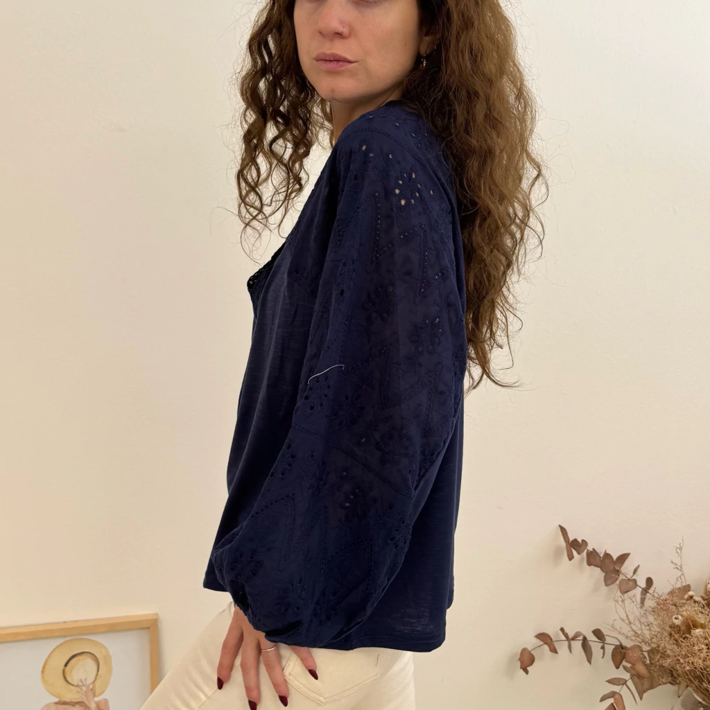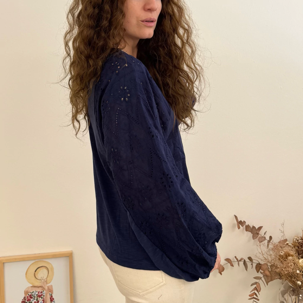 Descubre la Remera Sorelle, una prenda imprescindible para tu guardarropa. Esta remera está confeccionada en 100% algodón, lo que garantiza suavidad y comodidad en cada uso. Su diseño over size con un cuello V profundo y el detalle de broderie en mangas globo, le otorgan un toque sofisticado.